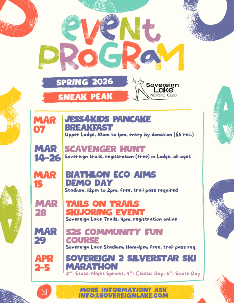 Sovereign Lake Nordic Club operates the one of the largest cross-country ski clubs in Canada. It operates and maintains over 105km of daily groomed XC Ski trails with our neighbour Silver Star Mountain Resort. SLNC is located at 1688m in Silverstar Provincial Park on the traditional, ancestral, unceded territory of the Syilx and Secwepemc peoples.