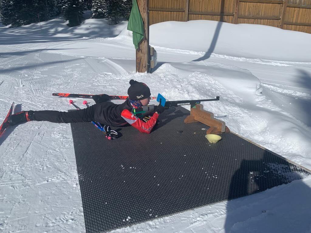 Because of their smaller stature and the weight of the rifles, kids do not shoot standing until ages 15-16. Until then all shooting is in the prone (lying on their belly) position. Initially they shoot large standing targets using a rest, then progress to smaller prone targets using a rest, then large targets without a rest (using a cuff and sling) and then small targets with a cuff and sling. At ages 15-16 biathletes carry their rifles only within the range. At ages 17+ they carry their rifles on the ski course as well but need a PAL in order to do so.